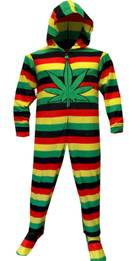 These adult-sized pajamas feature bright, Rasta-inspired patterns. Completed with multi-color pot leaves imprinted on the flannel-felt material, these are the most comfortable and thoughtfully-designed cannabis pajamas we’ve tried.
